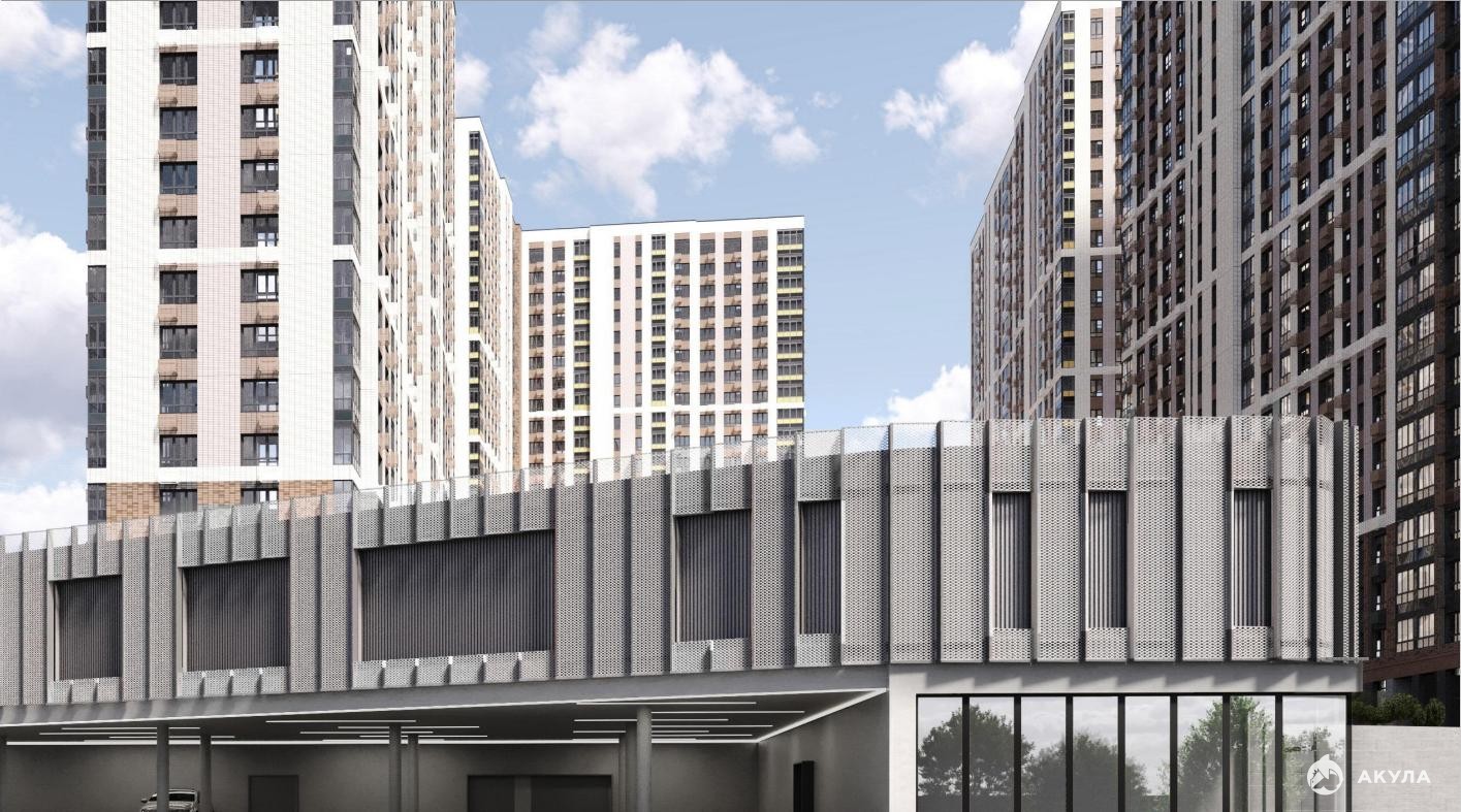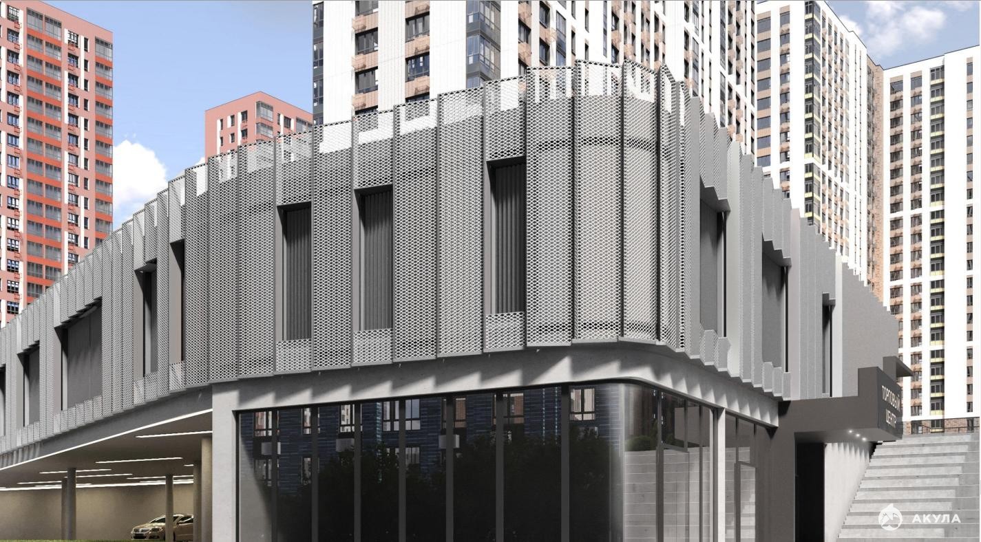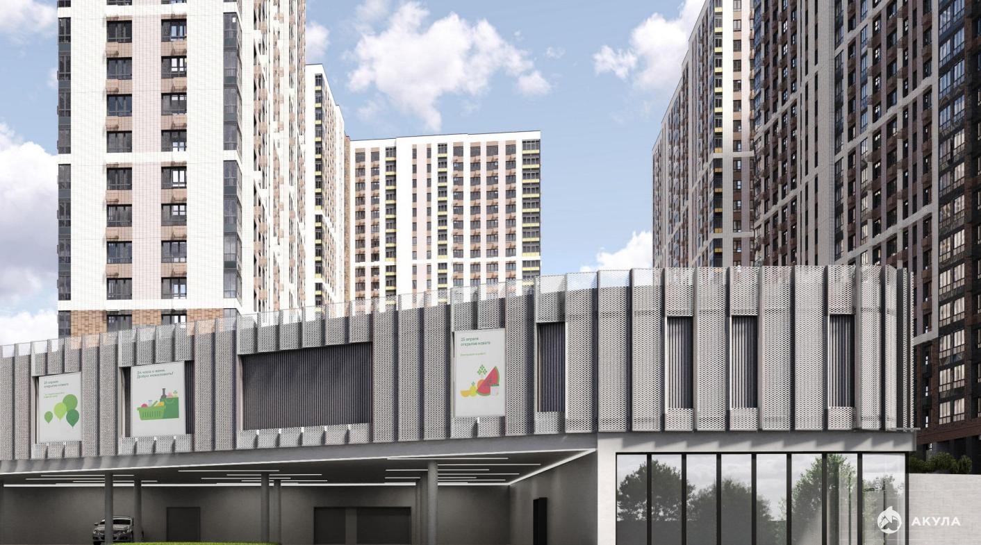 ТЦ находится в густонаселенном районе с высокой плотностью жилой застройки. Комплекс формируется вокруг нового общественного центра, а само здание оказывается в точке естественного притяжения пешеходов и автомобилистов.