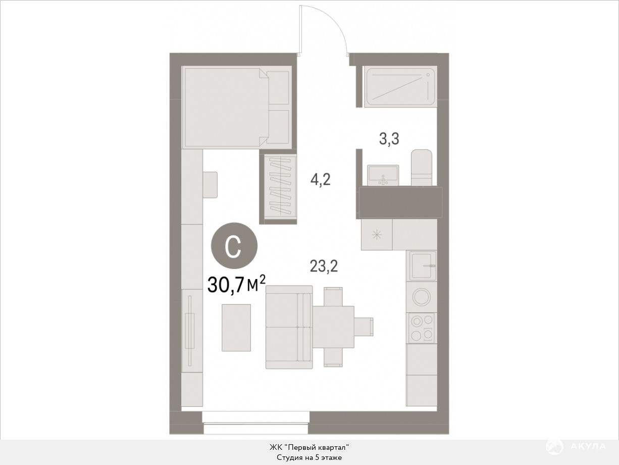 Однокомнатная студия с первичной отделкой в ЖК «Первый квартал» на 5 этаже. Общая площадь: 30.66 кв.м., площадь гостиной 23.2 кв.м., из которых 5 кв.м. выделено под кухонную зону. Все окна выходят на одну сторону. В квартире один совмещенный санузел. Высота потолков 2.7 м.