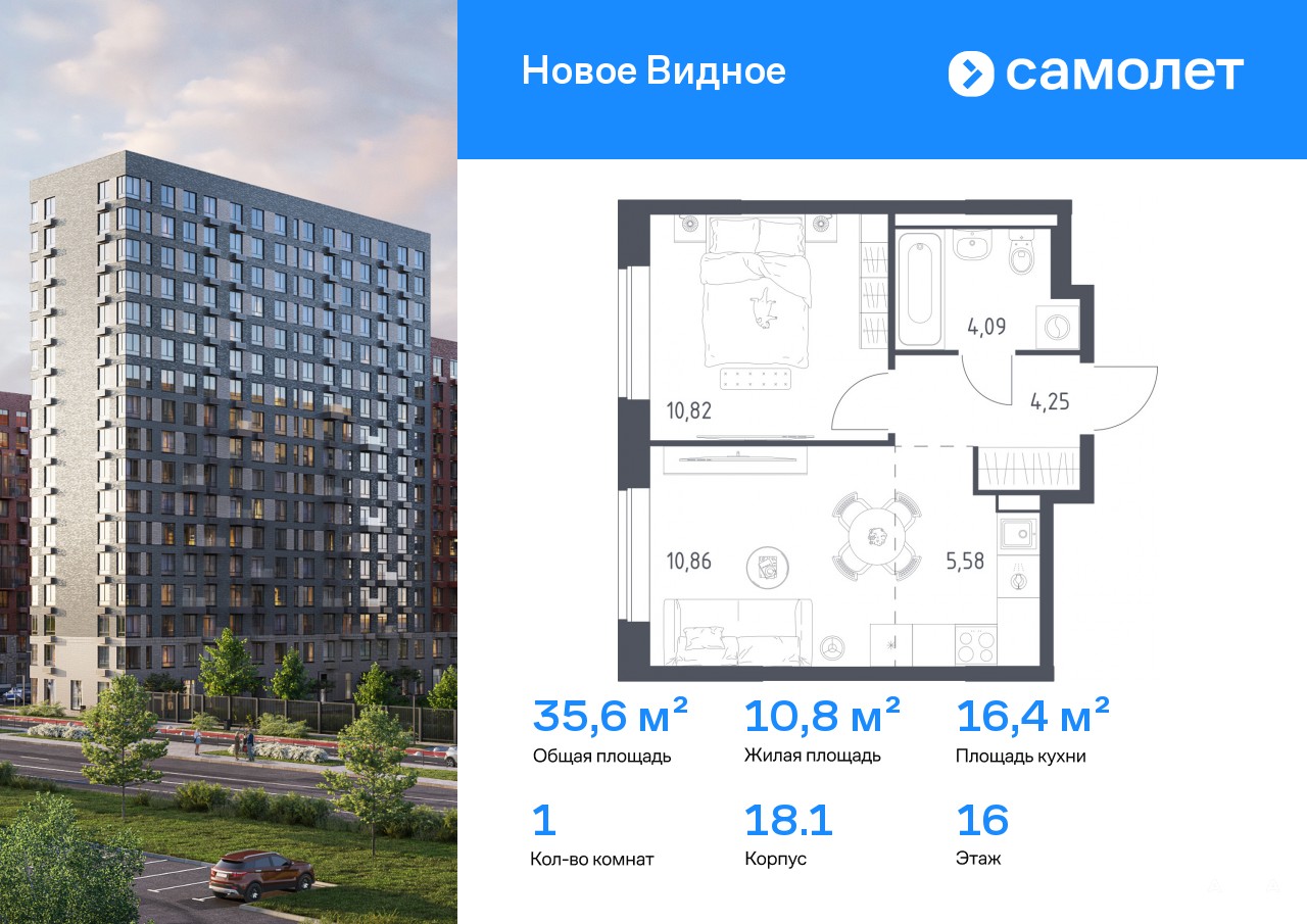 Строим кварталы для жизни с заботой о будущем. Предлагается 1-комнатная квартира комфорт-класса 35, 6 кв.м в корпусе 18.1 на 16 этаже, в ЖК «Новое Видное»