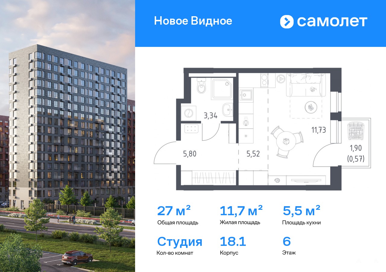 Строим кварталы для жизни с заботой о будущем. Предлагается квартира студия комфорт-класса 26, 96 кв.м в корпусе 18.1 на 6 этаже, в ЖК «Новое Видное»