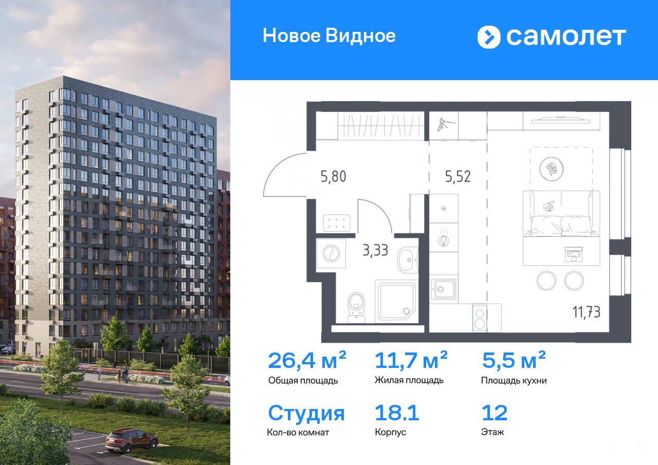 Строим кварталы для жизни с заботой о будущем. Предлагается квартира студия комфорт-класса 26, 38 кв.м в корпусе 18.1 на 12 этаже, в ЖК «Новое Видное»