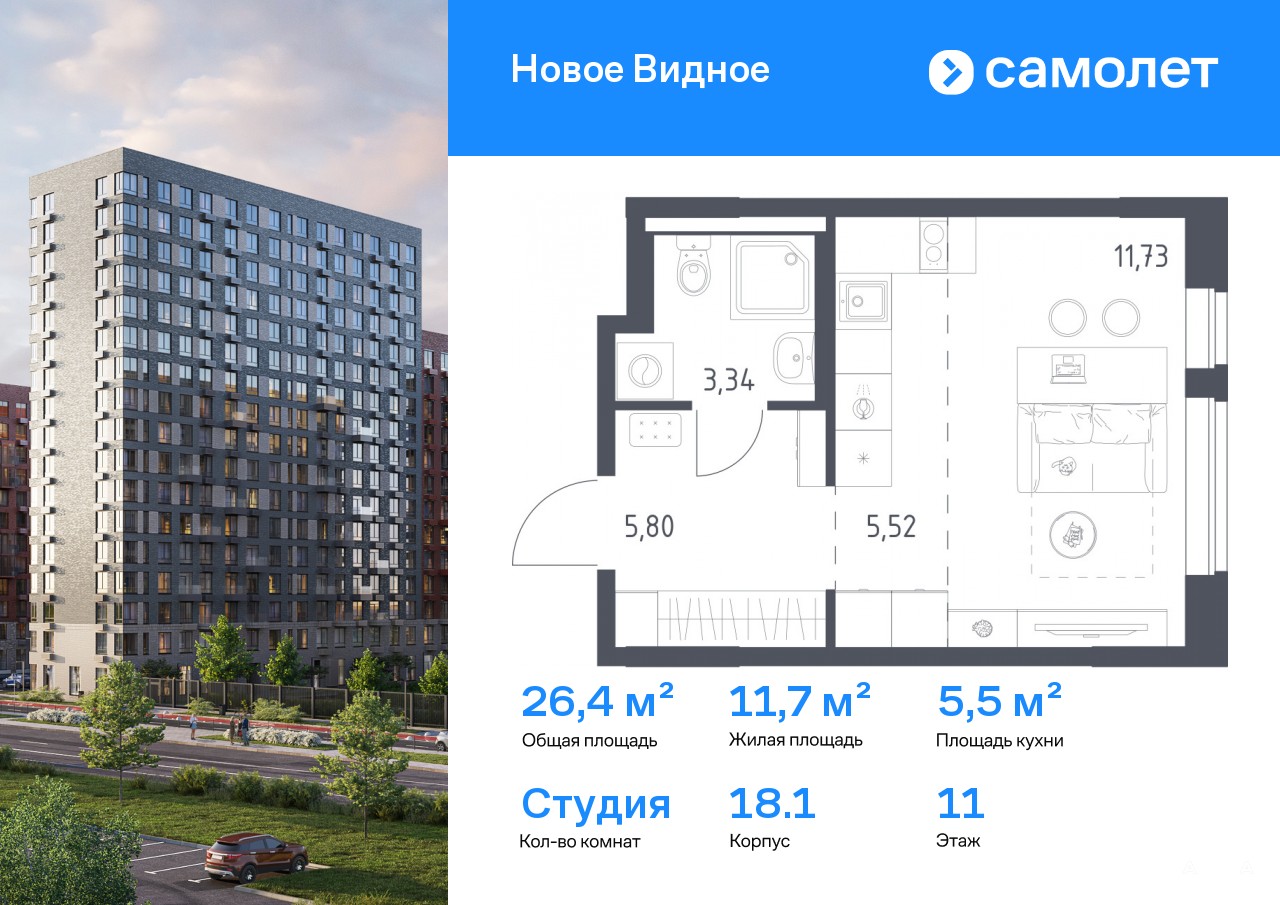 Строим кварталы для жизни с заботой о будущем. Предлагается квартира студия комфорт-класса 26, 39 кв.м в корпусе 18.1 на 11 этаже, в ЖК «Новое Видное»