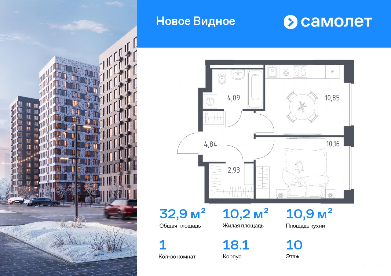 Строим кварталы для жизни с заботой о будущем. Предлагается 1-комнатная квартира комфорт-класса 32, 87 кв.м в корпусе 18.1 на 10 этаже, в ЖК «Новое Видное»