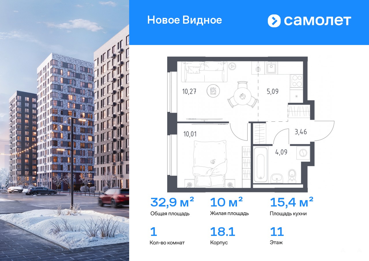 Строим кварталы для жизни с заботой о будущем. Предлагается 1-комнатная квартира комфорт-класса 32, 92 кв.м в корпусе 18.1 на 11 этаже, в ЖК «Новое Видное»