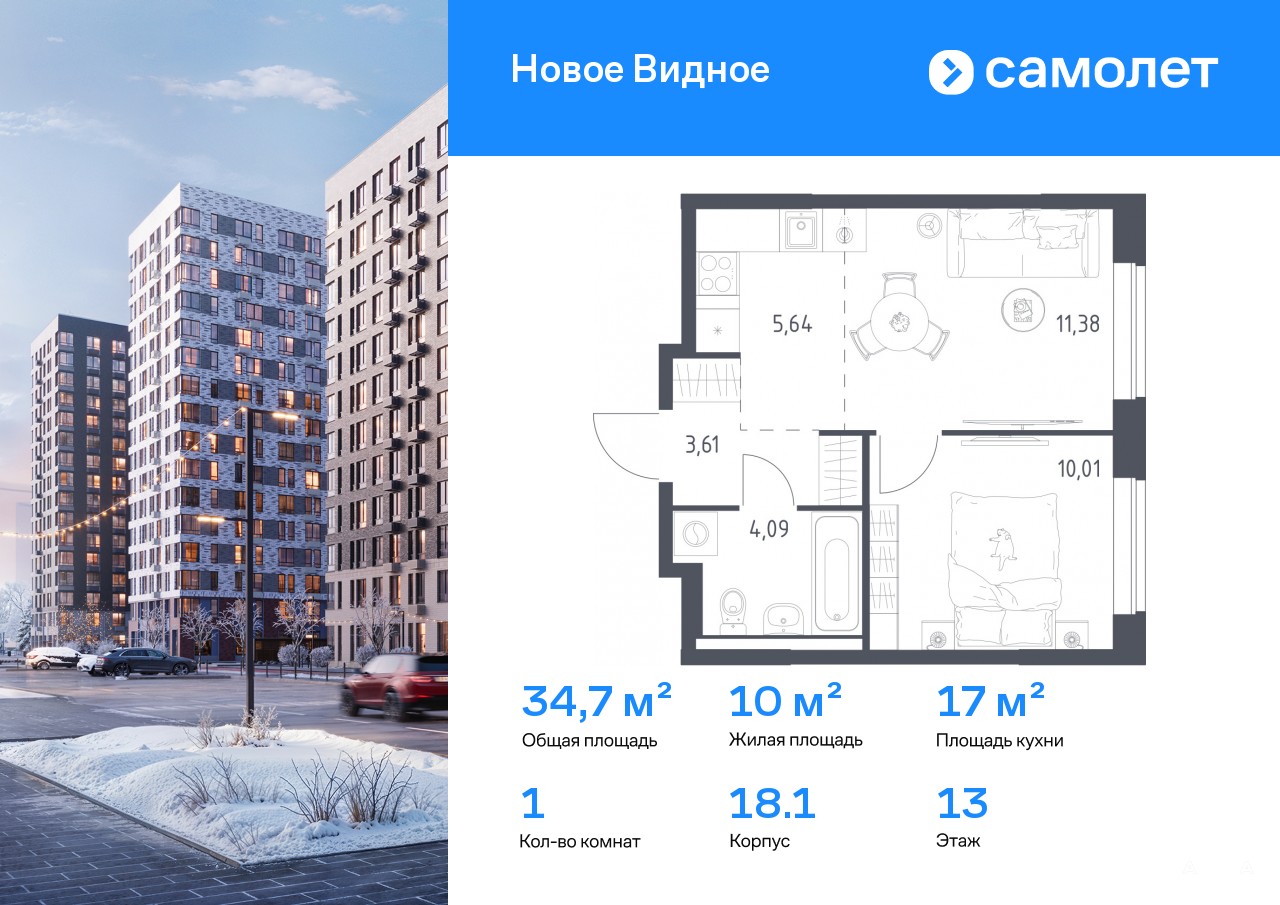 Строим кварталы для жизни с заботой о будущем. Предлагается 1-комнатная квартира комфорт-класса 34, 73 кв.м в корпусе 18.1 на 13 этаже, в ЖК «Новое Видное»