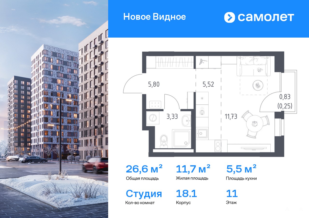 Строим кварталы для жизни с заботой о будущем. Предлагается квартира студия комфорт-класса 26, 63 кв.м в корпусе 18.1 на 11 этаже, в ЖК «Новое Видное»