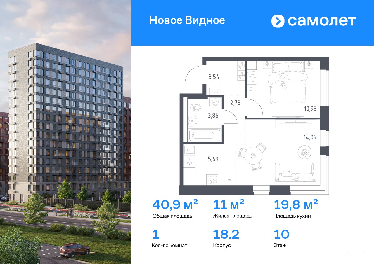 Строим кварталы для жизни с заботой о будущем. Предлагается 1-комнатная квартира комфорт-класса 40, 91 кв.м в корпусе 18.2 на 10 этаже, в ЖК «Новое Видное»