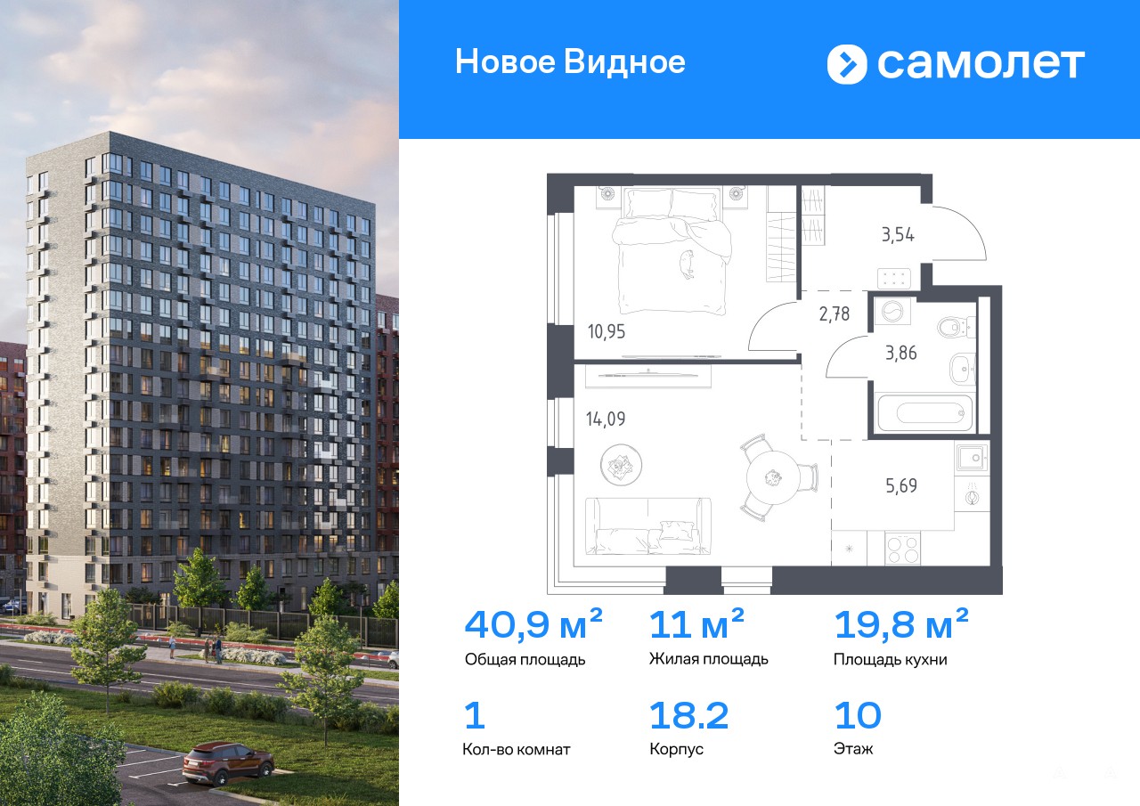 Строим кварталы для жизни с заботой о будущем. Предлагается 1-комнатная квартира комфорт-класса 40, 91 кв.м в корпусе 18.2 на 10 этаже, в ЖК «Новое Видное»