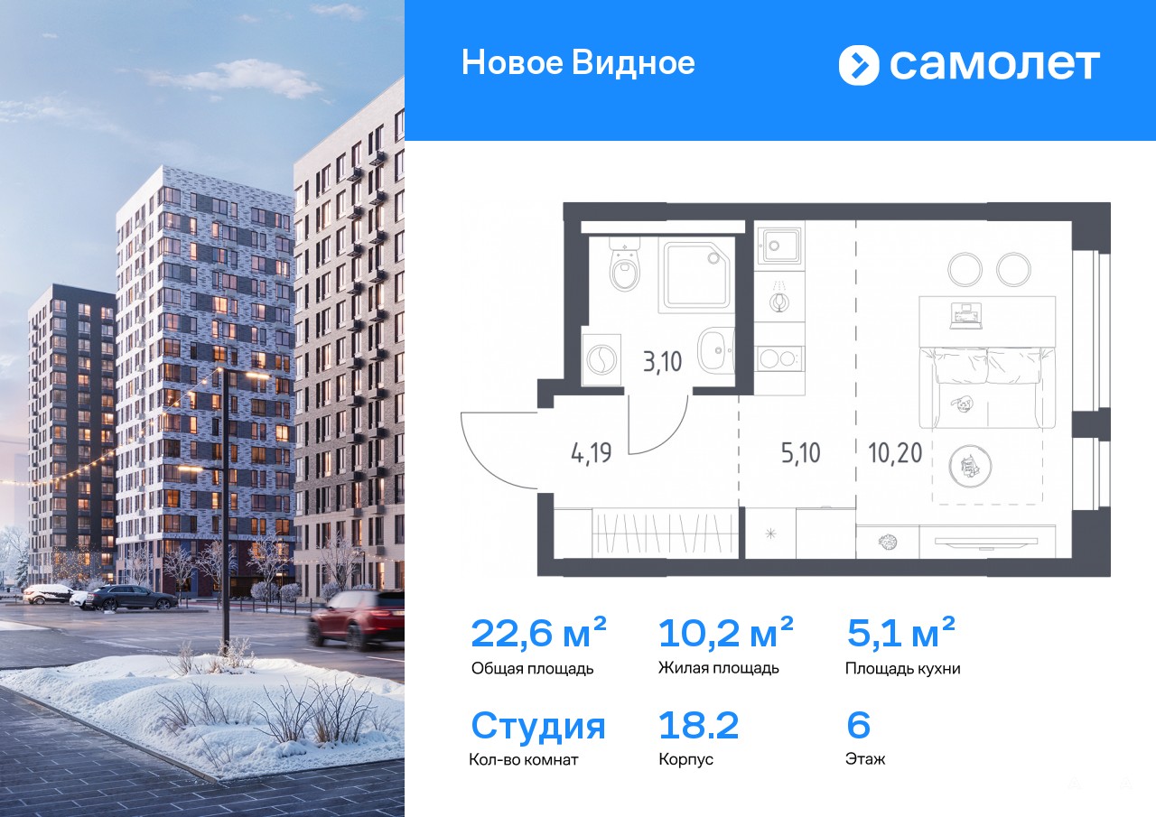 Строим кварталы для жизни с заботой о будущем. Предлагается квартира студия комфорт-класса 22, 59 кв.м в корпусе 18.2 на 6 этаже, в ЖК «Новое Видное»