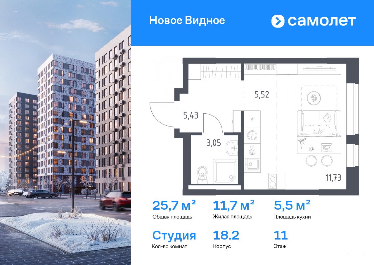 Строим кварталы для жизни с заботой о будущем. Предлагается квартира студия комфорт-класса 25, 73 кв.м в корпусе 18.2 на 11 этаже, в ЖК «Новое Видное»