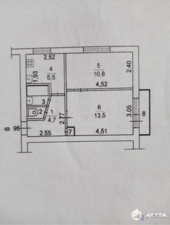 Общая площадь квартиры составляет 37, 9 квадратных метров плюс балкон. В квартире две комнаты: одна площадью 10, 8 кв.м, другая — 13, 5 кв.м. Кухня 5, 5 кв.м.