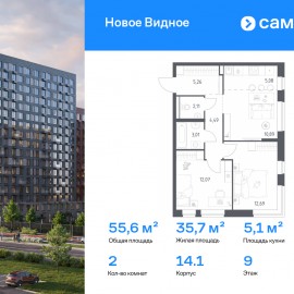 Строим кварталы для жизни с заботой о будущем. Предлагается 2-комнатная квартира комфорт-класса 55, 6 кв.м в корпусе 14.1 на 9 этаже, в ЖК «Новое Видное» Квартира без отделки. Доступность опции «отделка» и возможность комплектации мебелью и декором уточняйте у...