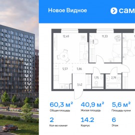 Строим кварталы для жизни с заботой о будущем. Предлагается 2-комнатная квартира комфорт-класса 60, 29 кв.м в корпусе 14.1 на 6 этаже, в ЖК «Новое Видное» Квартира без отделки. Доступность опции «отделка» и возможность комплектации мебелью и декором уточняйте у...