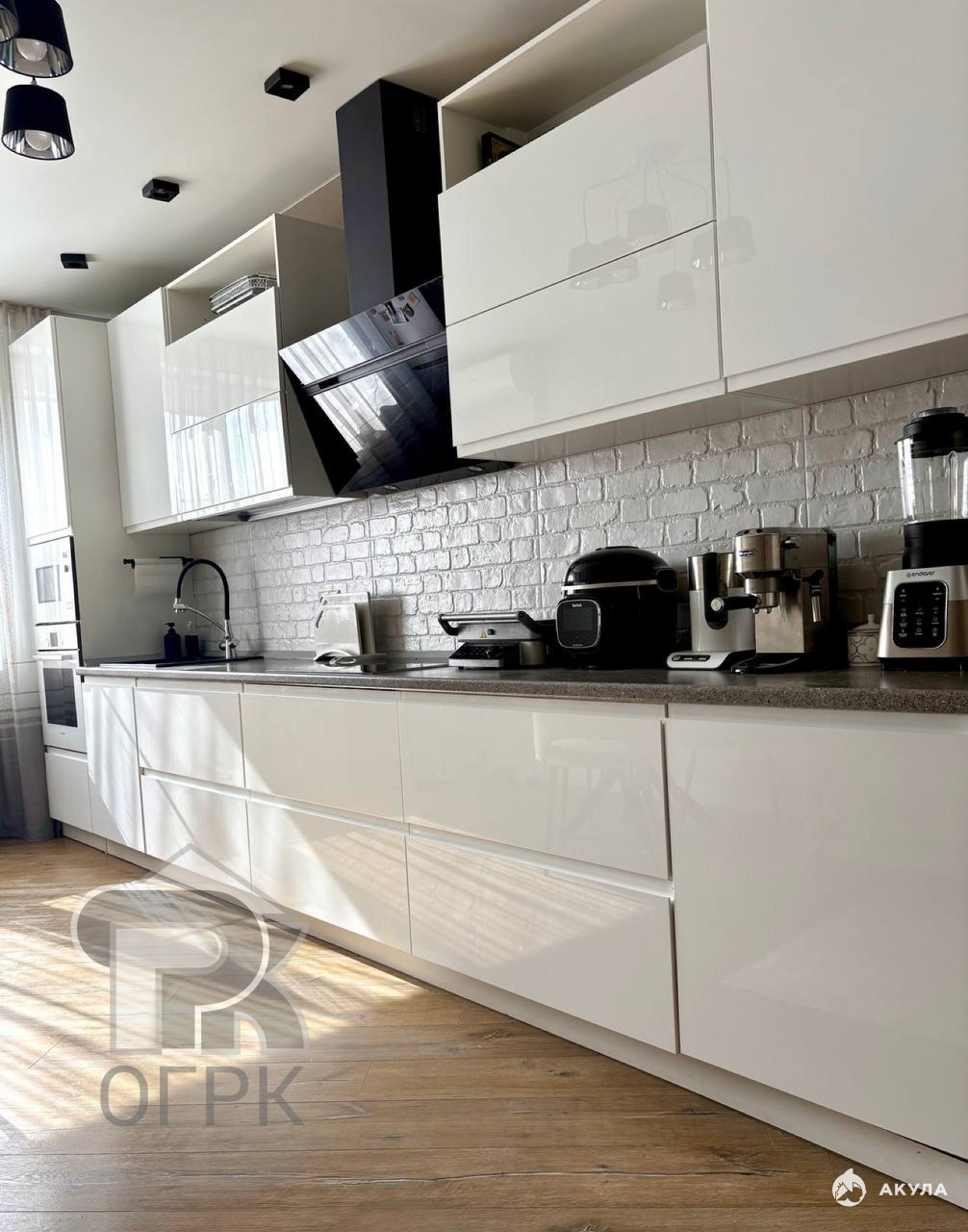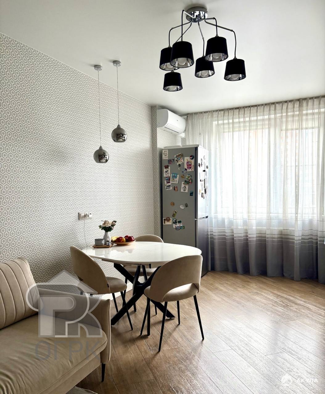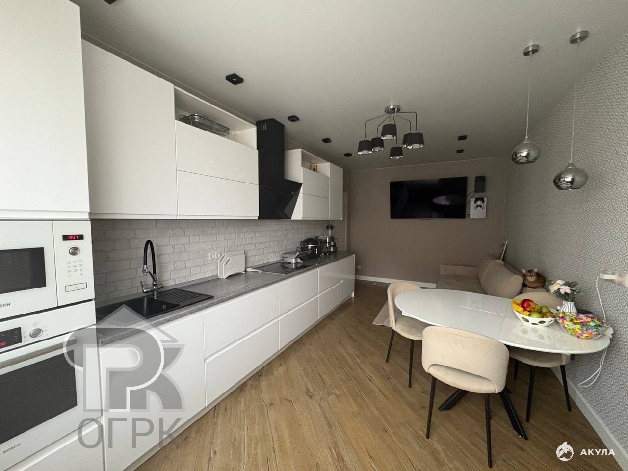 Кухня-гостиная: 19.5 кв м, кухня на заказ, фасады итальянский пластик с интегрированными ручками, встроенная техника Bosch (микроволновка, духовка, холодильник и ПМ 60 см), варочная панель Siemens, мощная вытяжка. Установлен кондиционер.