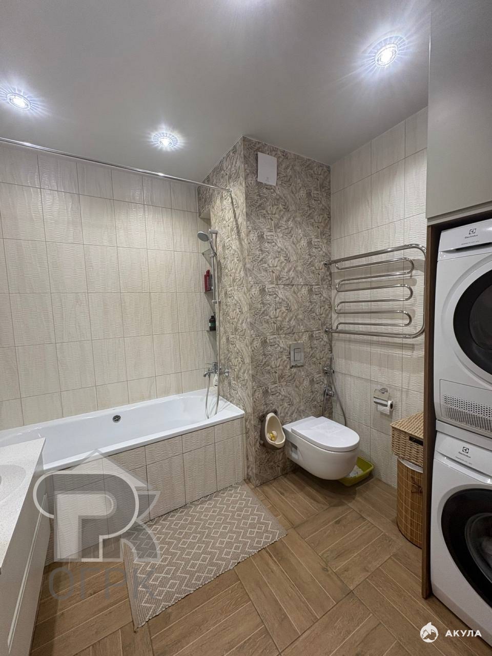Санузел совмещенный: 6 кв м. Теплые полы. Смесители Grohe, установлен сантехнический душ. Проточный водонагреватель. Ванная эмаль, полноразмерная. Парящее зеркало с мягкой подсветкой. Стиральная и сушильная машина Electrolux. Мебель на заказ, фасады МДФ в эмали с интегрированными ручками, много мест для хранения. Столешница искусственный камень.