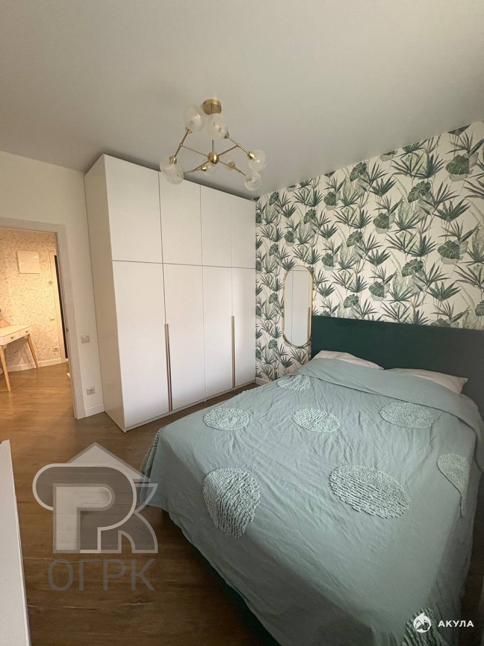 Спальня: 11.1 кв м, кровать со спальным местом 140, подъемный механизм. шкаф и полка навесные на заказ, фасады матовые МДФ.