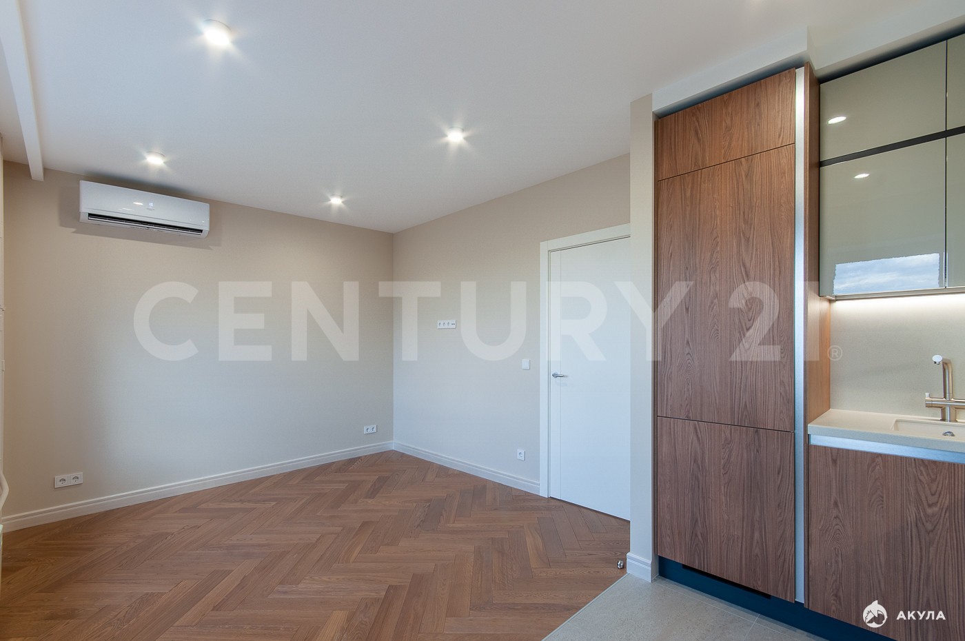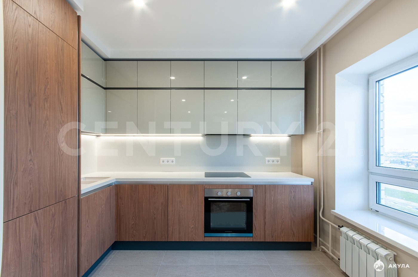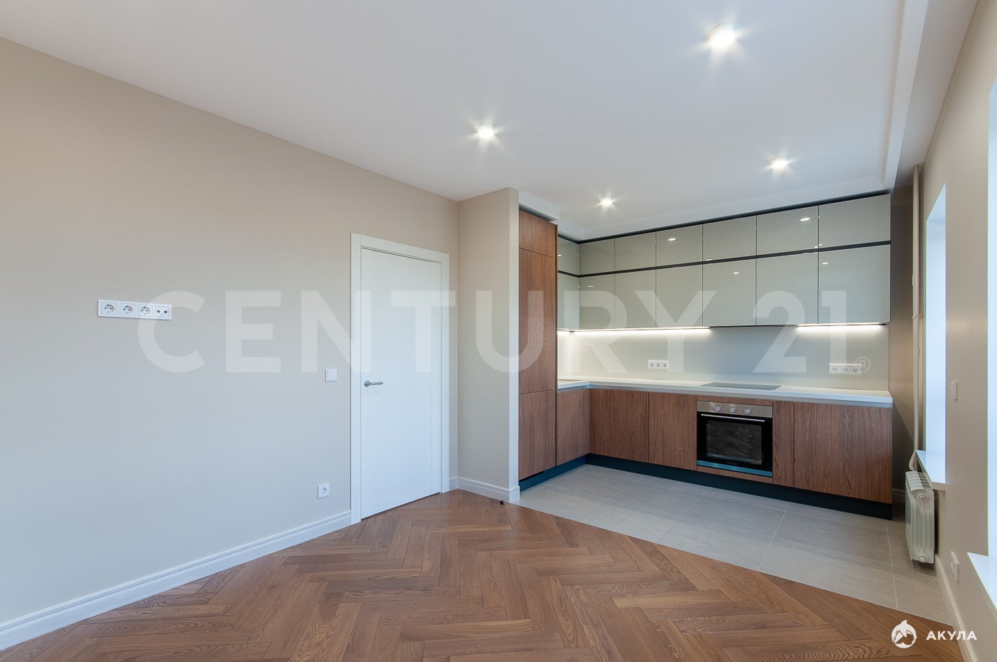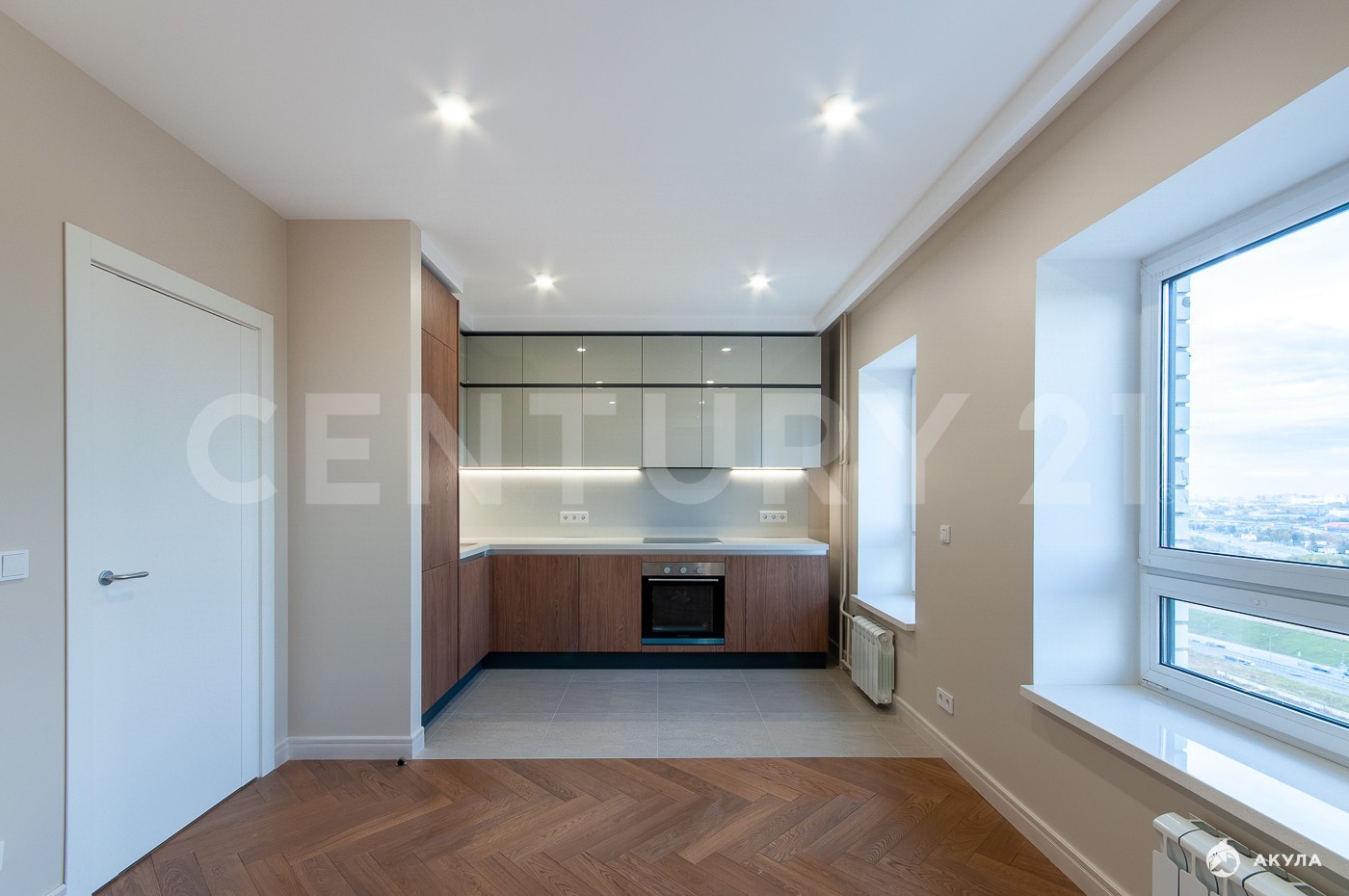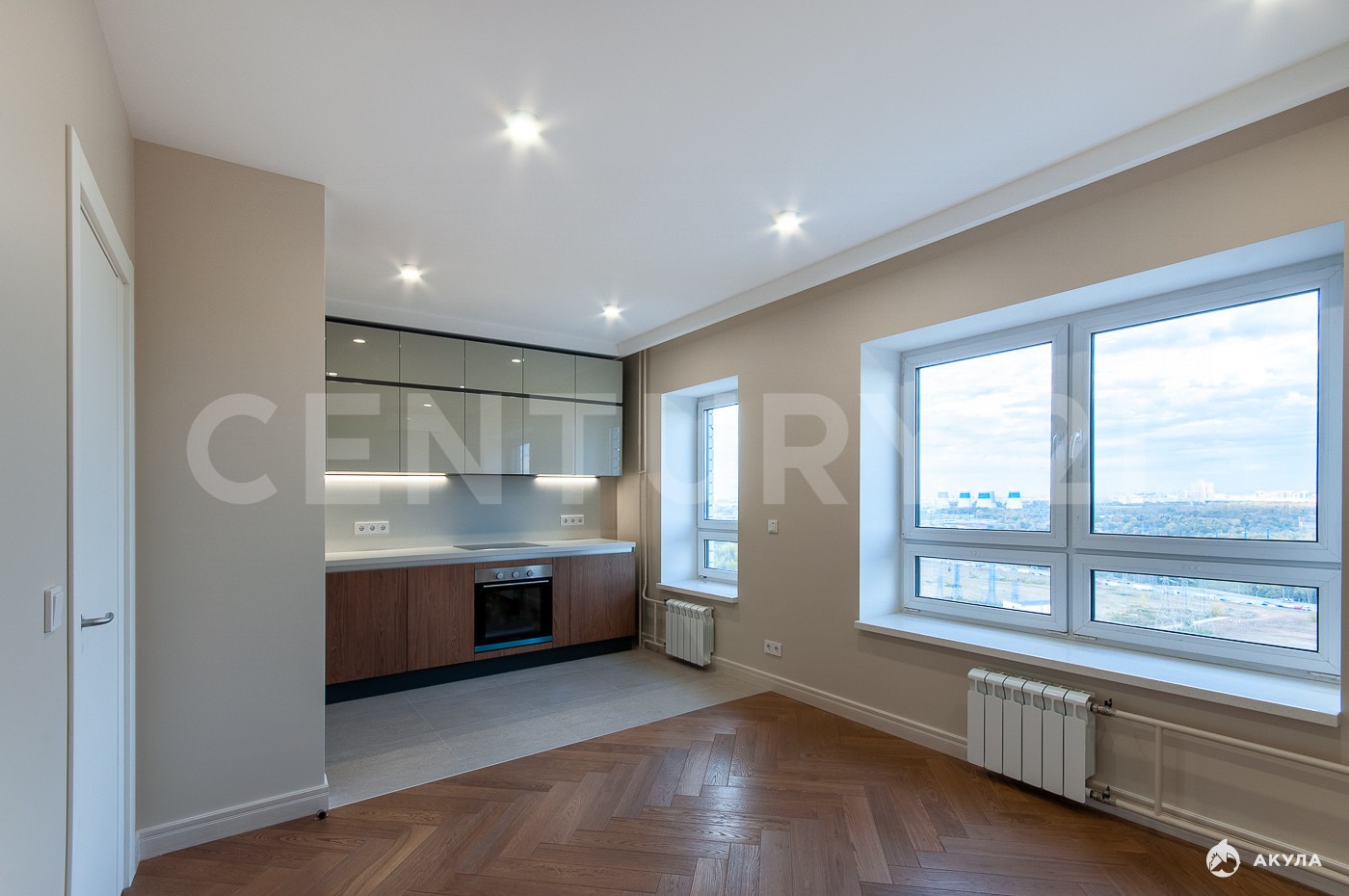 Квартира расположена на 22 этаже 25-этажного корпуса. Функциональная планировка распашонка включает в себя кухню-гостиную 17, 5 м2 с зоной отдыха и обеденной группой.