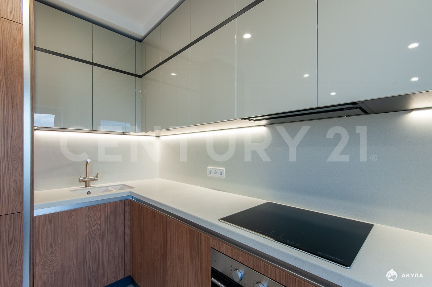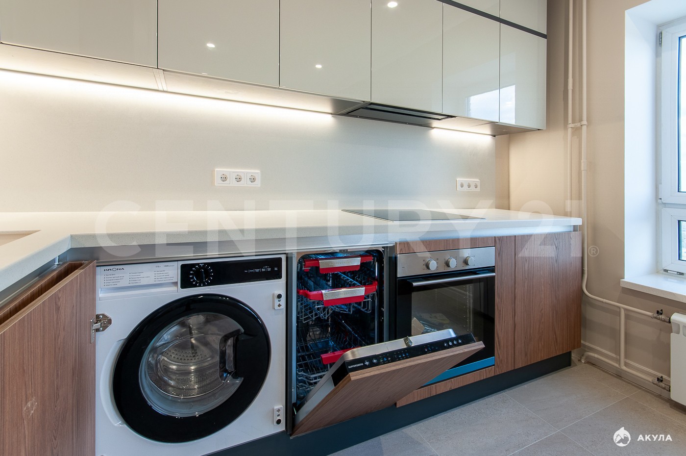 На кухне установлены гарнитур, холодильник, стиральная и посудомоечные машины фирмы Kuppersbush. Индукционная варочная панель и духовой шкаф обеспечены мощной вытяжкой для удаления запахов. Во всех комнатах и гостиной выведены раздельные кондиционеры.