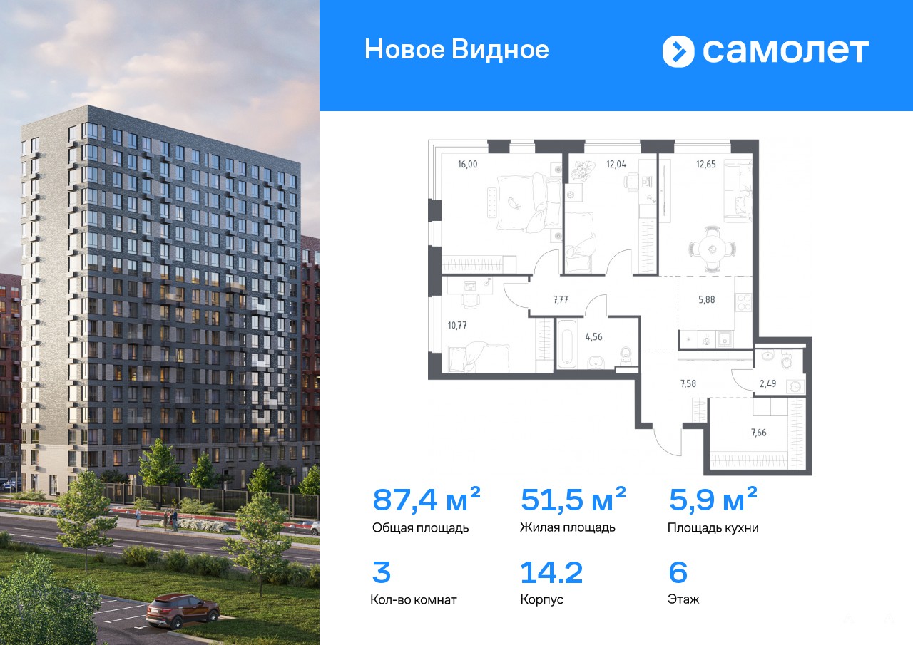 Строим кварталы для жизни с заботой о будущем. Предлагается 3-комнатная квартира комфорт-класса 87, 4 кв.м в корпусе 14.2 на 6 этаже, в ЖК «Новое Видное»